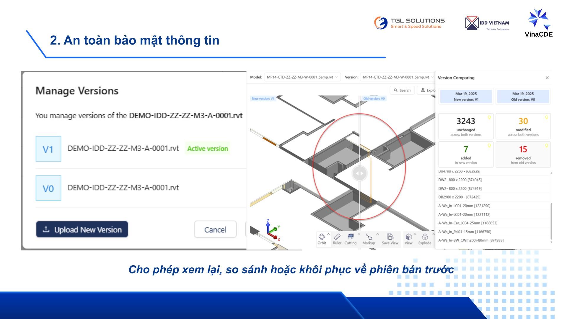 VinaCDE đảm bảo an toàn dữ liệu với máy chủ Viettel IDC, mã hóa Salted Hash, xác minh hai bước và phân quyền chi tiết theo tiêu chuẩn ISO 19650 & BIM Việt Nam.